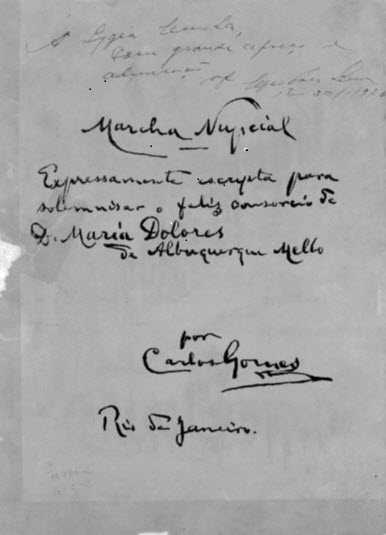 “Expressamente escrypta para solemnisar o feliz consórcio de d. Maria Dolores de Albuquerque Mello por Carlos Gomes. Rio de Janeiro”.